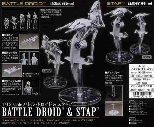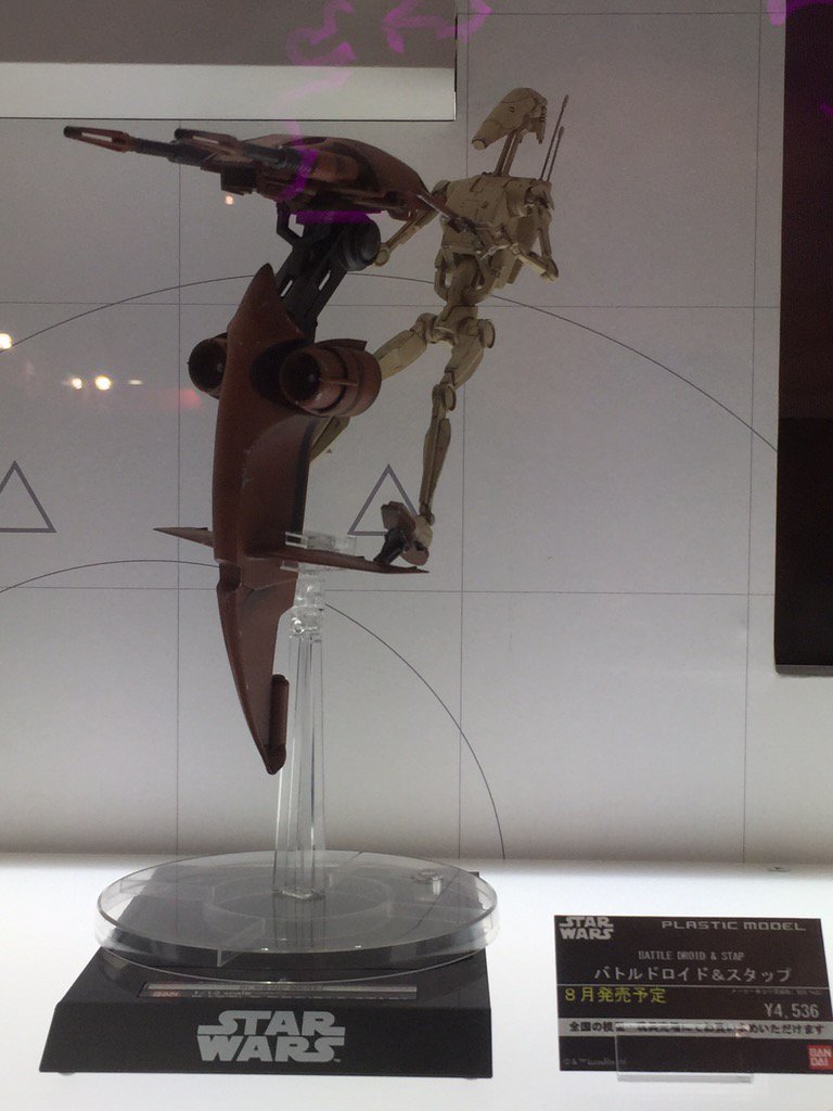 On the Tokyo international toy show 2016, Bandai revealed this jewel, the battle Droid with the Stap from the episode one movie from Star Wars Saga. As you can see in the pictures the kit is huge in 1/12 scale, even more in that clear stand that is also included on the model kit. Others features as well its the super articulation of the figure, you can pose in any way as shown on the movies, also include the blaster gun and Binoculars, even mention you the idea for a conversion with the C-3PO head !(not included). The release is expected to be August 31 in Japan, so make room on your stash for this little fella, cause they won’t last long!